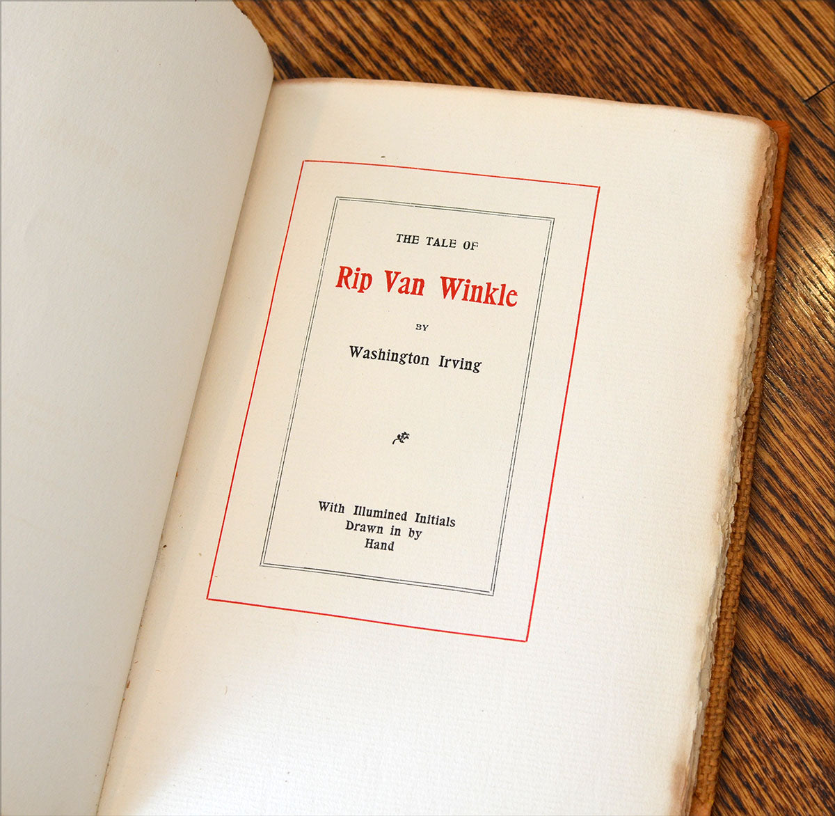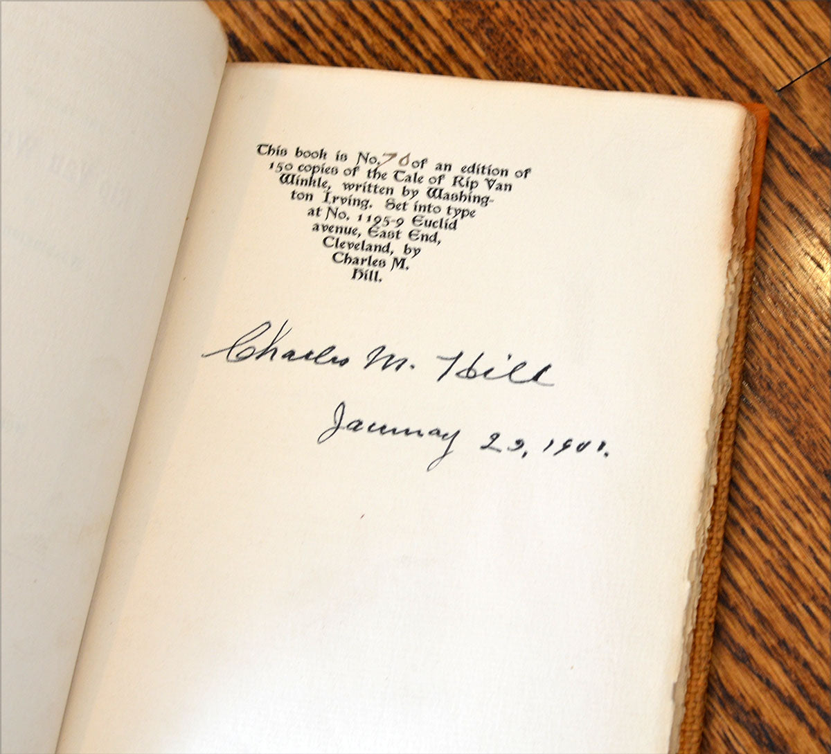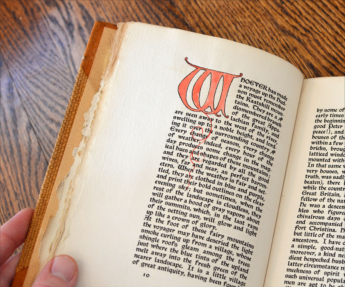 Irving, Washington. Rip Van Winkle. Cleveland: Waldo Press of Charles M. Hill, 1900. Limited to 150 copies, of which this is #70. Signed in black ink by Hill and dated "January 29, 1901" on limitation page. "With Illumined Initials Drawn in by Hand", done in various colors (presumably by Hill). Bound in 3/4 brown suede with coarse brown burlap boards; title stamped vertically on the front cover near spine. Measures approx. 6.25" x 9.25".